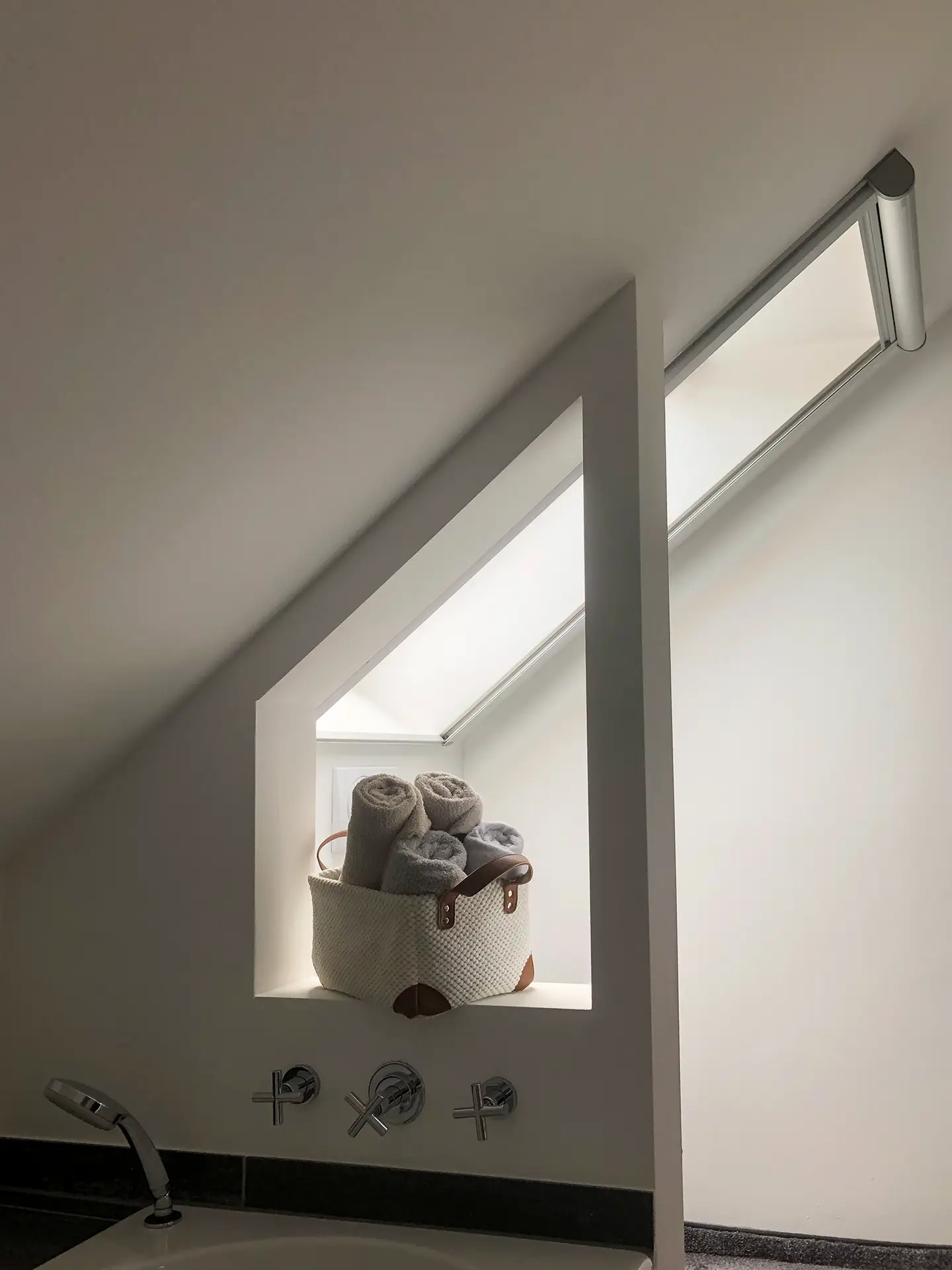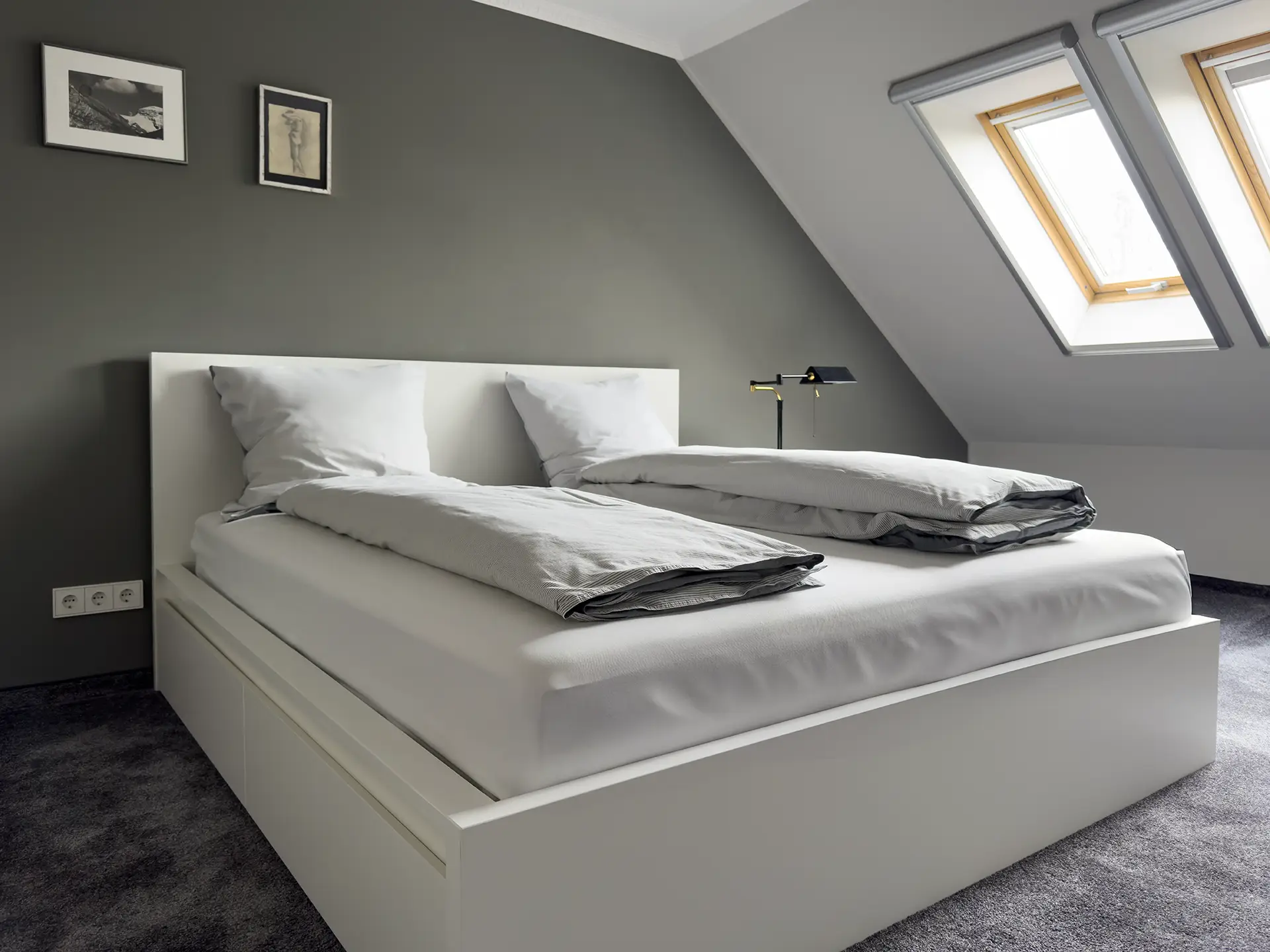 Über eine großzügige Treppe im Flur erreichen Sie das Dachgeschoss, in dem sich das stilvolle Badezimmer mit Badewanne, Dusche, WC und Waschtisch befindet. Die drei individuell gestalteten Schlafzimmer bieten höchsten Schlafkomfort: Das linke Schlafzimmer verfügt über ein 180 cm breites Doppelbett sowie eine gemütliche Galerie mit einem weiteren 140 cm Bett. Im rechten Schlafzimmer steht ebenfalls ein 180 cm breites Doppelbett, während das weitere linke Schlafzimmer mit zwei 90 cm breiten Betten ausgestattet ist.