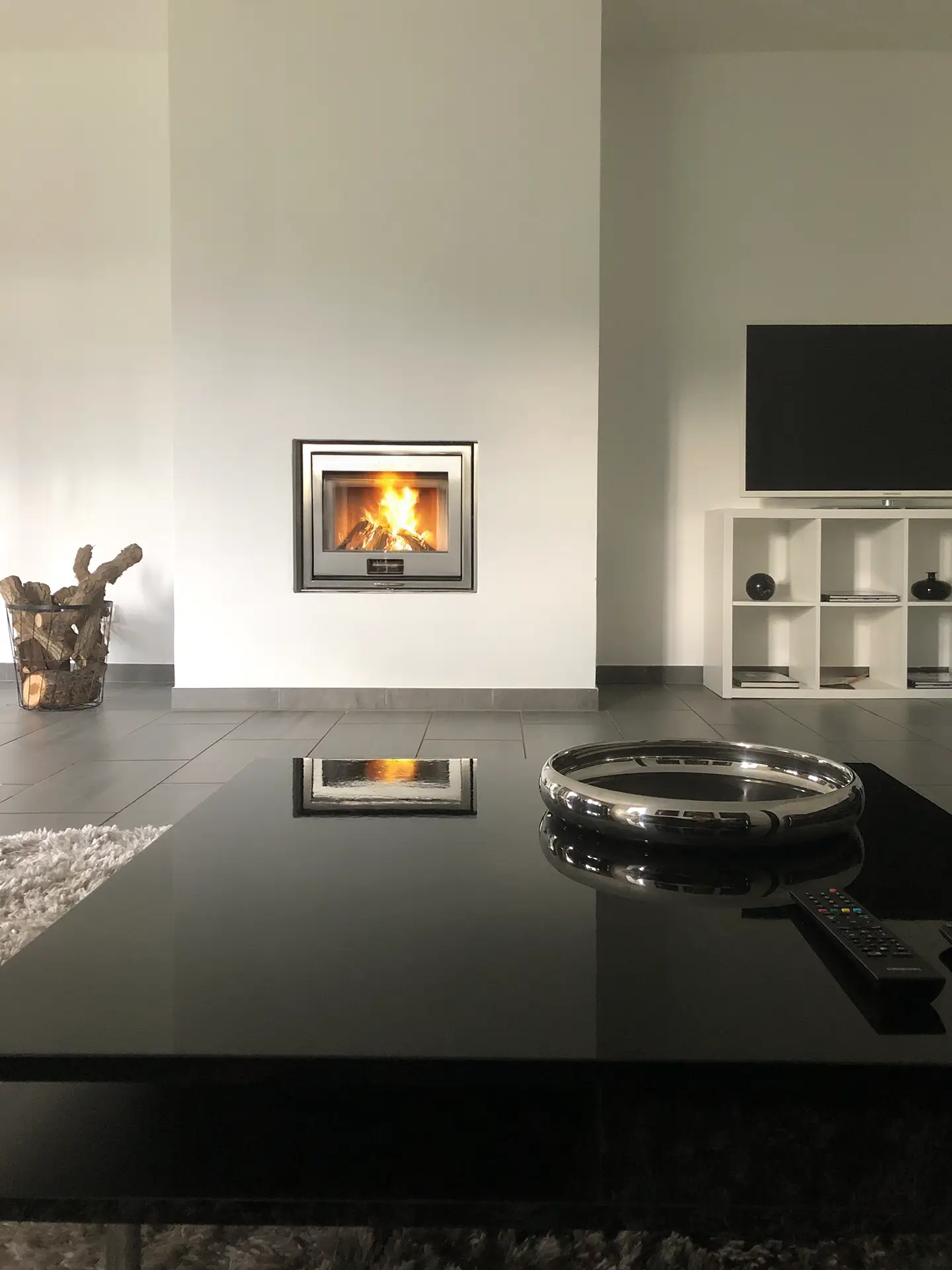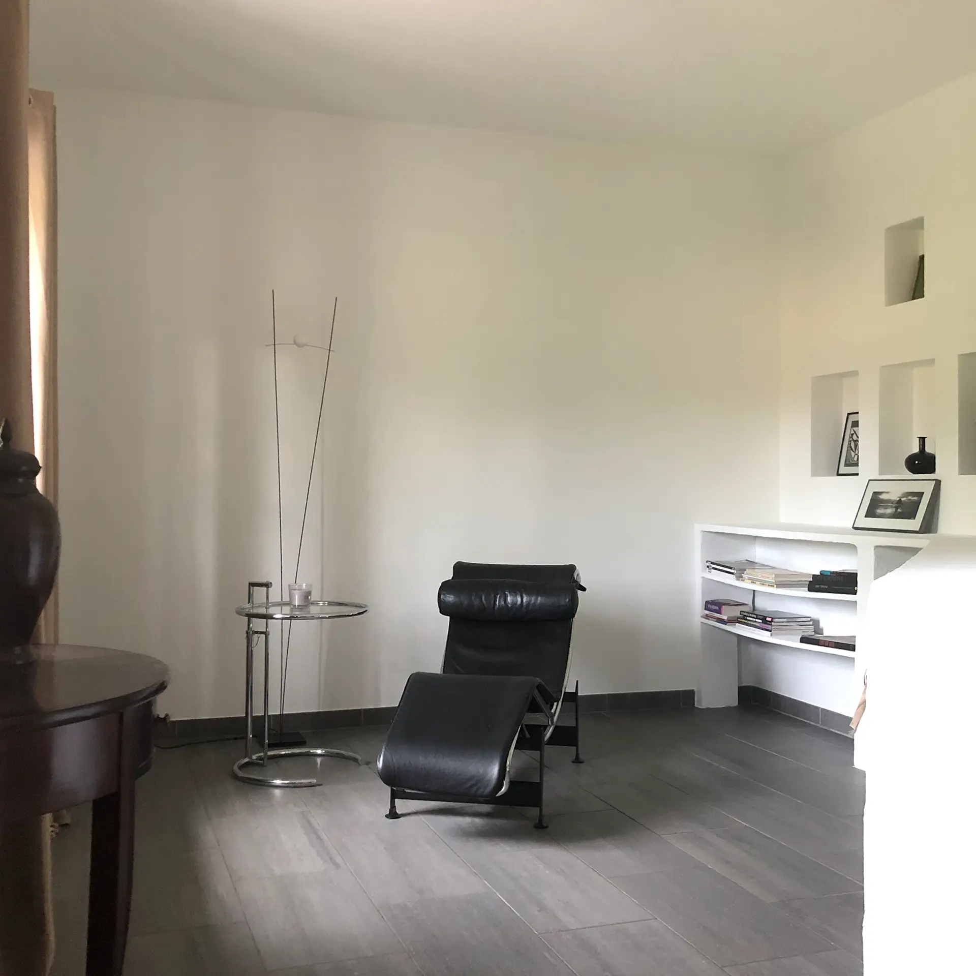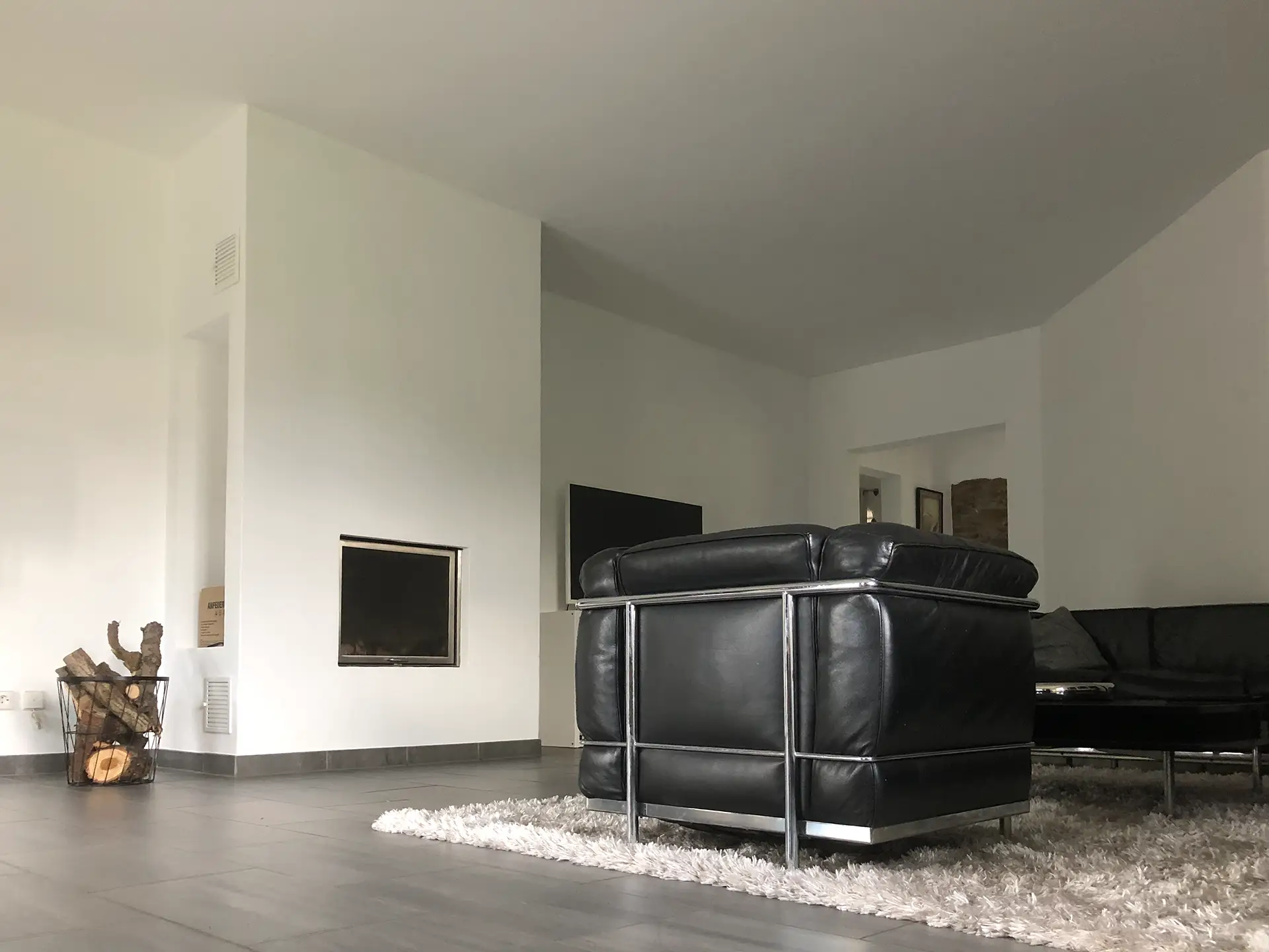 Im unteren Geschoss empfängt Sie ein weitläufiger Flur mit Zugang zum Gäste-WC. Ein offener Durchgang führt in das lichtdurchflutete Arbeitszimmer mit Ethernet-Anschluss – ideal für produktive Stunden in entspannter Umgebung. Herzstück der Etage ist das beeindruckende, rund 70 qm große Wohnzimmer mit offenem Kamin, zwei eleganten Le Corbusier Sofas und einem passenden Sessel. Angrenzend, aber harmonisch integriert, befindet sich die großzügige, voll ausgestattete Leicht-Küche, die zum gemeinsamen Kochen einlädt. Durch große Türen gelangen Sie direkt auf den 25 qm großen Balkon, auf dem Sie die Morgensonne genießen können.